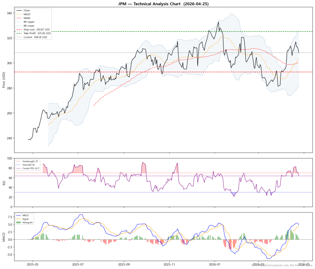 As of April 25, 2026, JP모건 shows a 🟡 Neutral / Watch signal (Score: +2/6). Rsi at 63.7 is in neutral territory, and price sits within the Bollinger Bands (60% from the lower band). Golden Cross in place (bullish trend) / MACD confirms upward momentum. Based on technical analysis, the suggested Stop-Loss is 292.87 USD and Take-Profit is 325.28 USD.